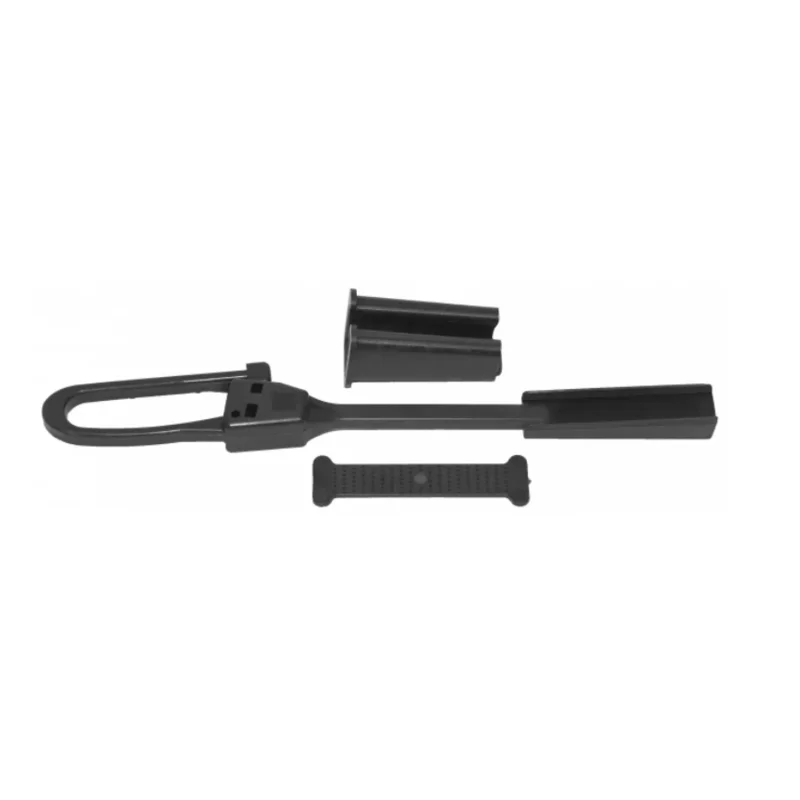 Натяжной зажим состоит из открытого корпуса с оребренной контактной поверхностью, клина и вставки, которая прокладывается между кабелем и клином.