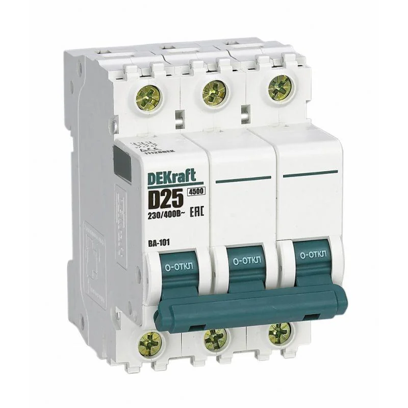 Автоматический выключатель серии ВА-101 DEKraft; 3P; номинальный ток 25 А; характеристика D; отключающая способность 4,5 кА. Новый механизм расцепления мгновенно разрывает цепь при возникновении аварии. 5 монолитных заклепок повышают прочность корпуса аппарата. Сплошная лицевая панель обеспечивает безопасность эксплуатации аппарата. Боковые каналы охлаждения повышают стабильность работы при высоких температурах окружающей среды. Полностью автоматизированный контроль качества производства.