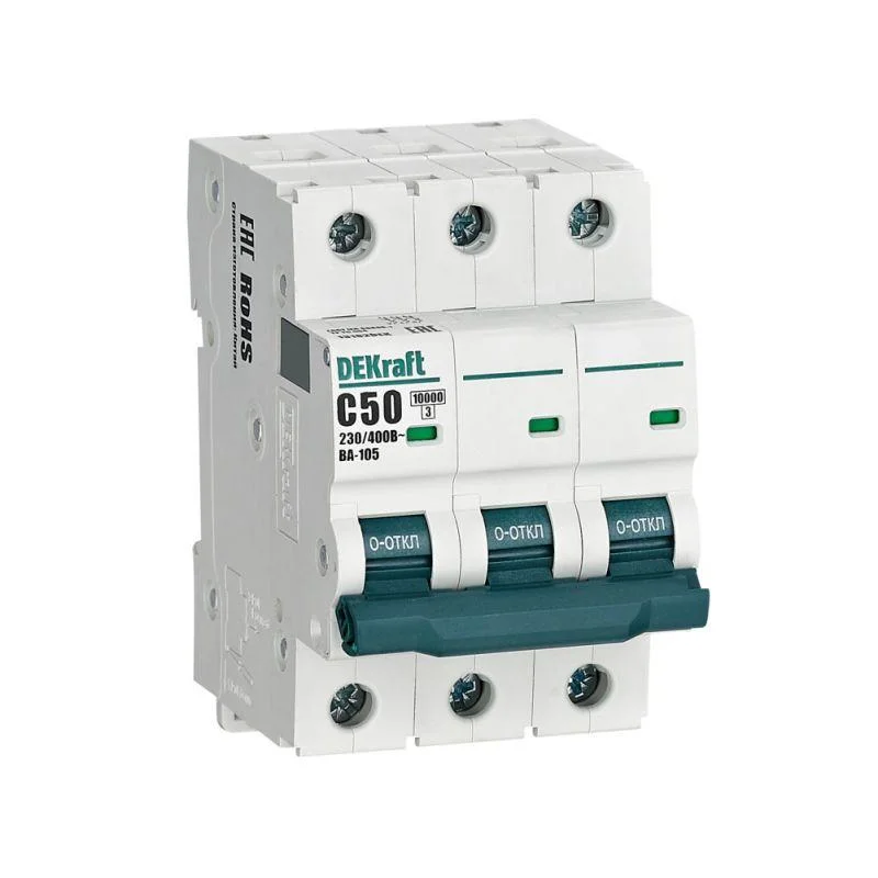 Автоматический выключатель серии ВА-105 DEKraft; 3P; ном. ток 50 А; характеристика C; откл. способность Icn = 10 кА; установка – на DIN-рейку; ширина – 3 мод. х 18мм. Преимуществом выключателей ВА-105 является их высокая механическая и электрическая износостойкость — в 20 000 и 10 000 циклов соответственно. Аппараты ВА-105 имеют возможность применения независимых расцепителей на переменный и постоянный ток, а также возможность установки устройств на аппараты гребенчатых шин типа PIN.