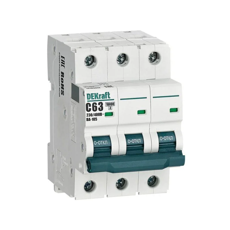 Автоматический выключатель серии ВА-105 DEKraft; 3P; ном. ток 63 А; характеристика C; откл. способность Icn = 10 кА; установка – на DIN-рейку; ширина – 3 мод. х 18мм. Преимуществом выключателей ВА-105 является их высокая механическая и электрическая износостойкость — в 20 000 и 10 000 циклов соответственно. Аппараты ВА-105 имеют возможность применения независимых расцепителей на переменный и постоянный ток, а также возможность установки устройств на аппараты гребенчатых шин типа PIN.