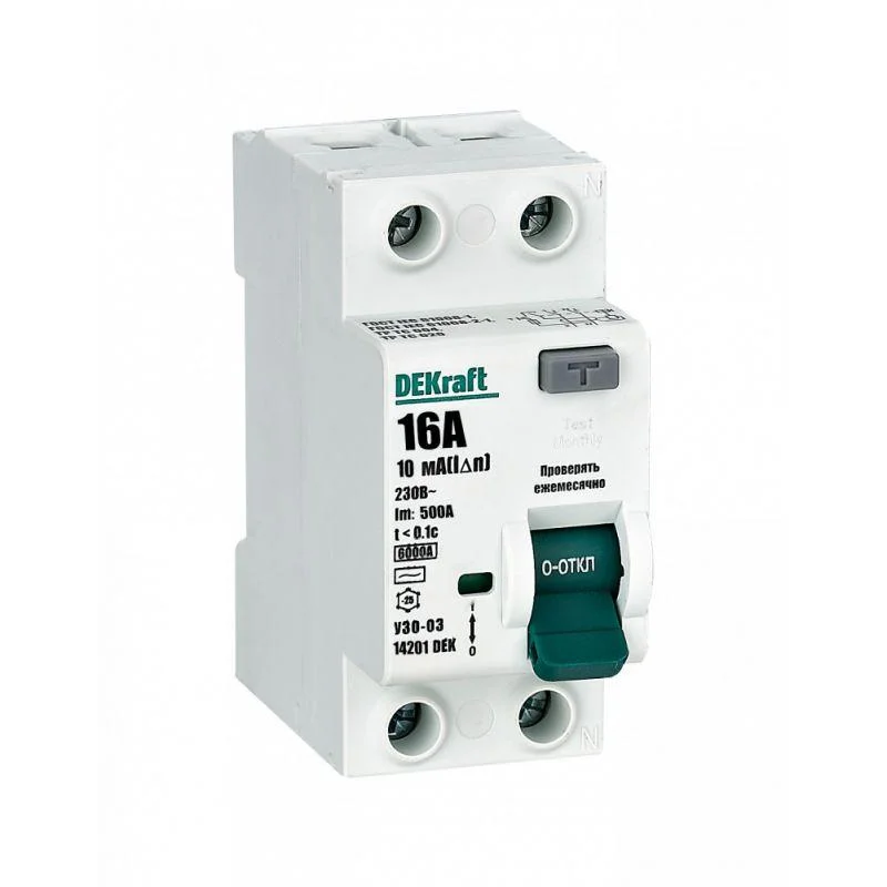 Выключатель дифференциального тока серии УЗО-03 DEKraft; 2P; номинальный ток 16 А; ном.дифф. ток 10 мА; электромеханический; тип дифференциального расцепителя - AC; на DIN-рейку. ВДТ устанавливаются в сетях напряжением до 400 В пер.тока. ВДТ применяются для защиты электроустановок от риска возникновения пожаров вследствие утечек тока. Конструкция устройств позволяет эксплуатировать их даже при низкой температуре.При сборке выключатель дифференциального тока (ВДТ) и автоматический выключатель (для защиты ВДТ) устанавливаются последовательно, при этом номинальный ток аппарата должен быть на одну ступень выше — т. е. 20А при установке последовательно с автоматом на 16А, 32А при установке с автоматом на 25А.