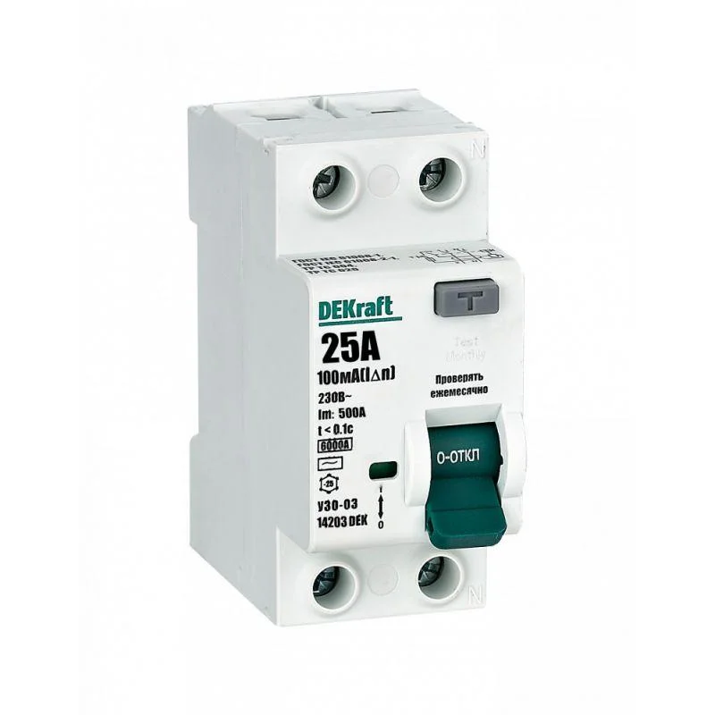 Выключатель дифференциального тока серии УЗО-03 DEKraft; 2P; номинальный ток 25 А; ном.дифф. ток 10 мА; электромеханический; тип дифференциального расцепителя - AC; на DIN-рейку. ВДТ устанавливаются в сетях напряжением до 400 В пер.тока. ВДТ применяются для защиты электроустановок от риска возникновения пожаров вследствие утечек тока. Конструкция устройств позволяет эксплуатировать их даже при низкой температуре.При сборке выключатель дифференциального тока (ВДТ) и автоматический выключатель (для защиты ВДТ) устанавливаются последовательно, при этом номинальный ток аппарата должен быть на одну ступень выше — т. е. 20А при установке последовательно с автоматом на 16А, 32А при установке с автоматом на 25А.
