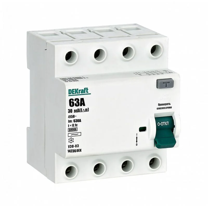 Выключатель дифференциального тока серии УЗО-03 DEKraft; 4P; номинальный ток 63 А; ном.дифф. ток 30 мА; электромеханический; тип дифференциального расцепителя - AC; на DIN-рейку. ВДТ устанавливаются в сетях напряжением до 400 В пер.тока. ВДТ применяются для защиты электроустановок от риска возникновения пожаров вследствие утечек тока. Конструкция устройств позволяет эксплуатировать их даже при низкой температуре.При сборке выключатель дифференциального тока (ВДТ) и автоматический выключатель (для защиты ВДТ) устанавливаются последовательно, при этом номинальный ток аппарата должен быть на одну ступень выше — т. е. 20А при установке последовательно с автоматом на 16А, 32А при установке с автоматом на 25А.