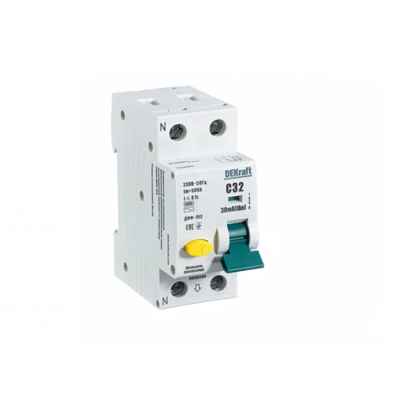 Автоматический выключатель дифференциального тока серии ДИФ-103 DEKraft; 1P+N; ном.ток 32 А; характеристика C; откл.способность Icn = 6 kA; ток утечки 30 мА; тип - АС; блок дифф.защиты – электронный; ширина – 2 мод. х 18 мм; монтаж – на DIN-рейку. АВДТ применяются в сетях напряжением до 220 В пер.тока для защиты человека от поражения электрическим током и электроустановок от сверхтоков и токов утечки. Аппараты ДИФ-103 являются более компактным вариантом АВДТ по сравнению с серией ДИФ-101.