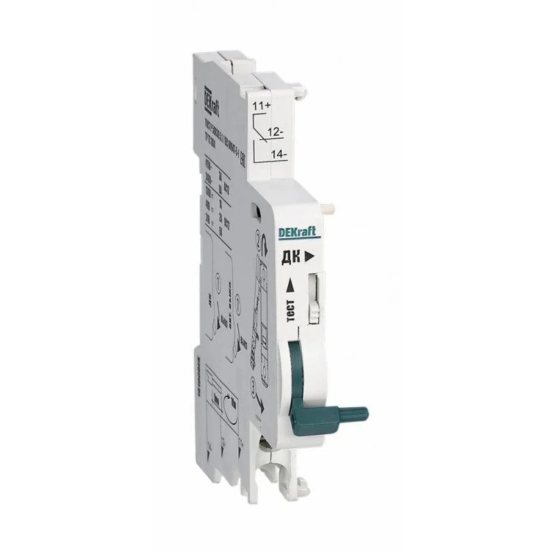 Контакт дополнительный ДК-101 для автоматических выключателей серии ВА-101 DEKraft; предназначен для сигнализации состояния выключателя ВКЛ/ОТКЛ; тип контакта – переключающий; номинальный ток – 6 А; ном.напряжение – 220 В пер.тока; ширина – 9 мм; установка – на DIN-рейку; присоединение к выключателю слева. Переключение контактов ДК-103 происходит, даже если рукоятка управления выключателя удерживается во взведенном положении.