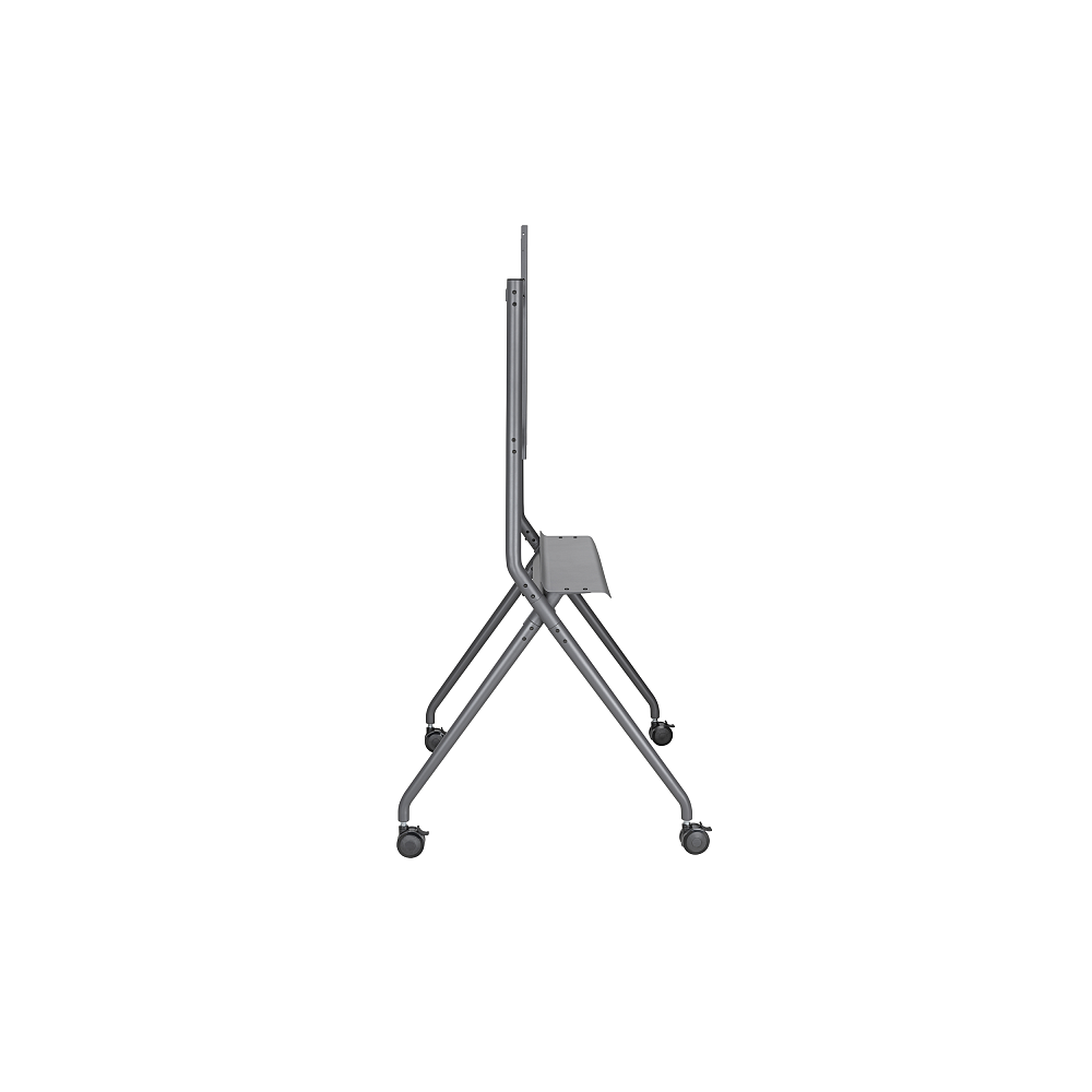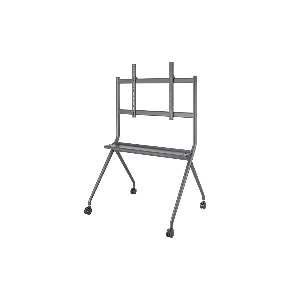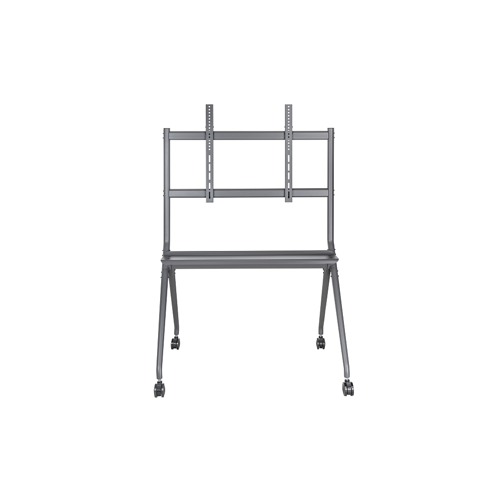 Предназначена для ТВ-панелей с диагональю 50-86". Имеет регулировку по высоте и полку для аксессуаров. Цвет — серебристый, материал — алюминий.