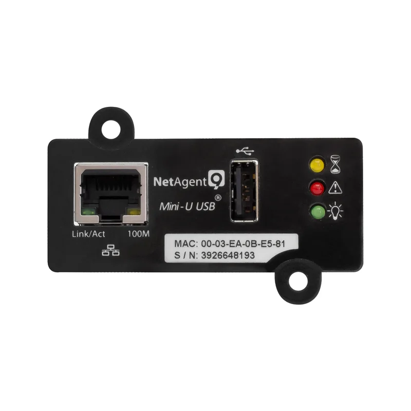 Карта SNMP предназначена для удаленного мониторинга и управления ИБП через локальную сеть Ethernet или Интернет. Позволяет в режиме реального времени получать информацию о состоянии электросети и ИБП. Благодаря наличию встроенного http-сервера доступ к карте может осуществляться через любой веб-браузер. В качестве дополнительной опции, карта имеет возможность осуществлять мониторинг температуры, влажности и протечки при подключенном датчике USB Netfeeler (в комплекте отсутствует). С характеристиками можно ознакомится в документации в соотвествущей вкладке "Документация и ПО".