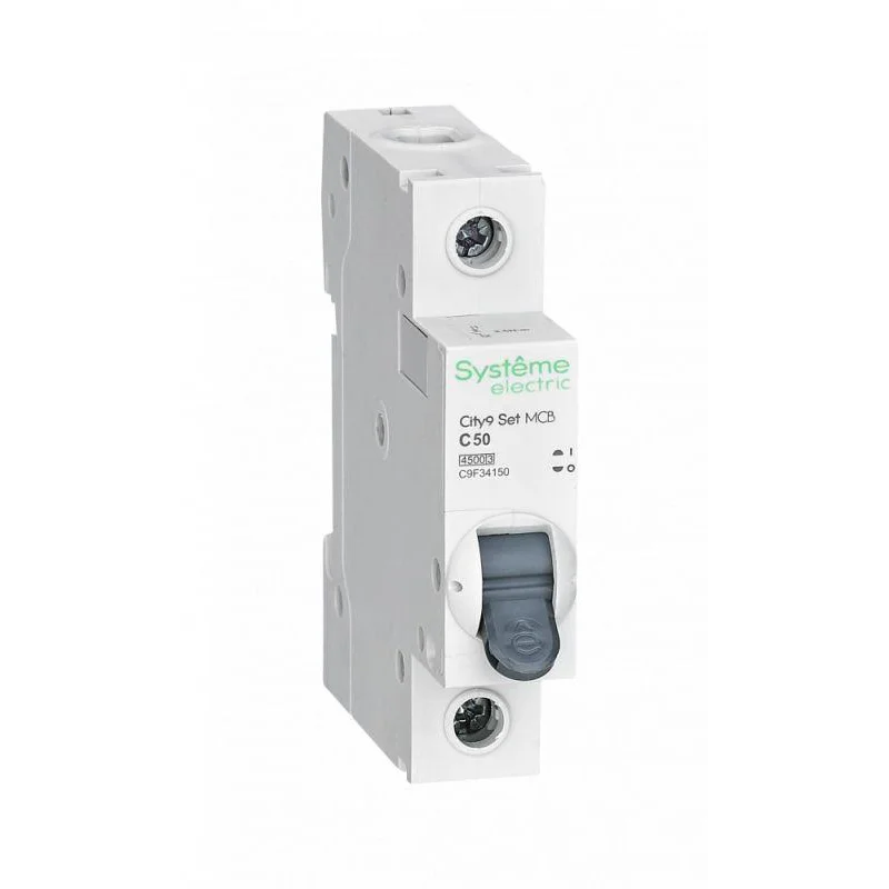 Автоматический выключатель серии City9 Set Systeme Electric, 1-полюсный, номинальный ток 50 А, характеристика С, Icn = 4.5 кА. Применяется в электрических сетях напряжением 230 В. Предназначен для защиты от перегрузок и токов короткого замыкания. Оснащен механизмом «мгновенной коммутации». Ударопрочный корпус из специального пластика с 6 металлическими заклепками. Безопасные клеммы исключают попадание кабелей в заклеммное пространство.