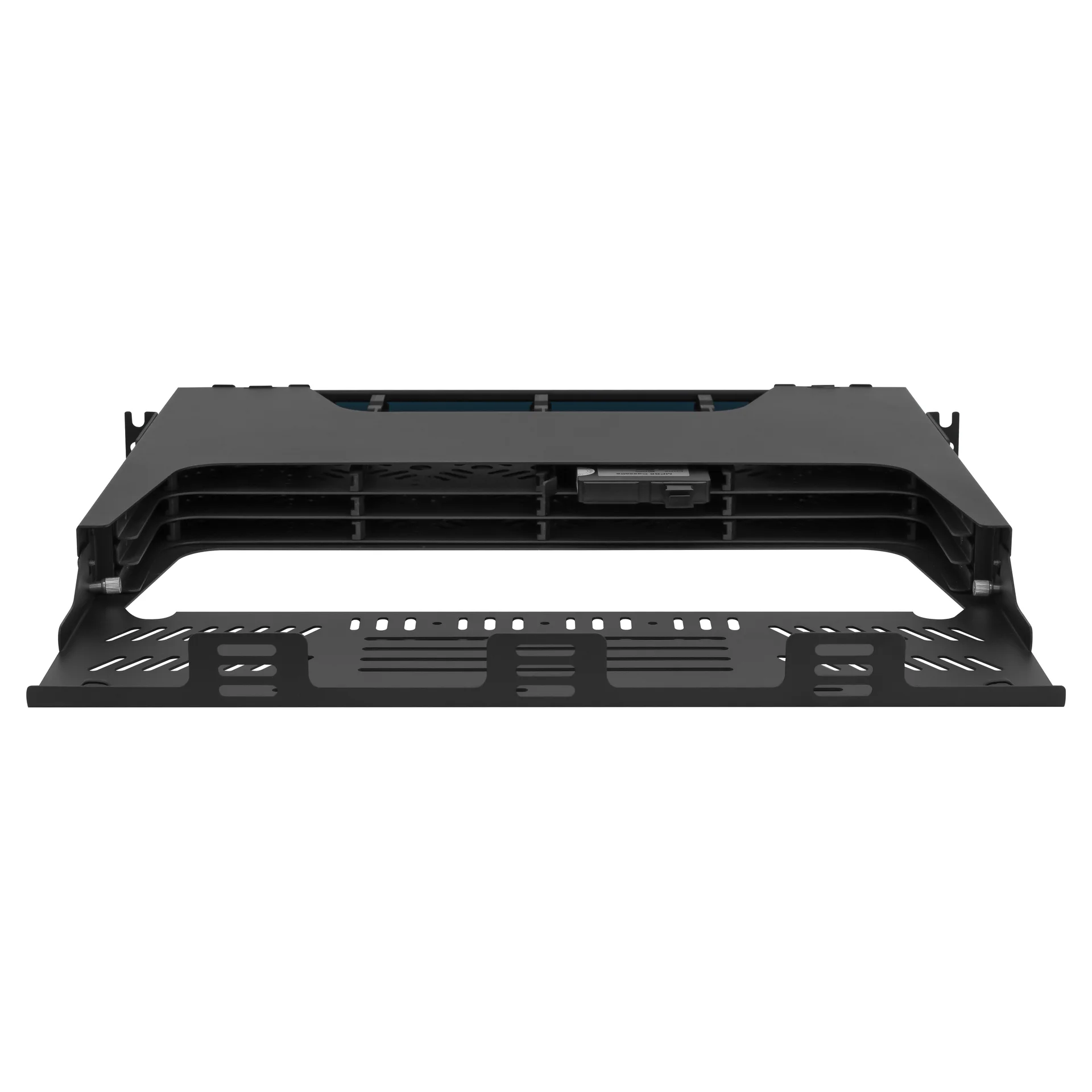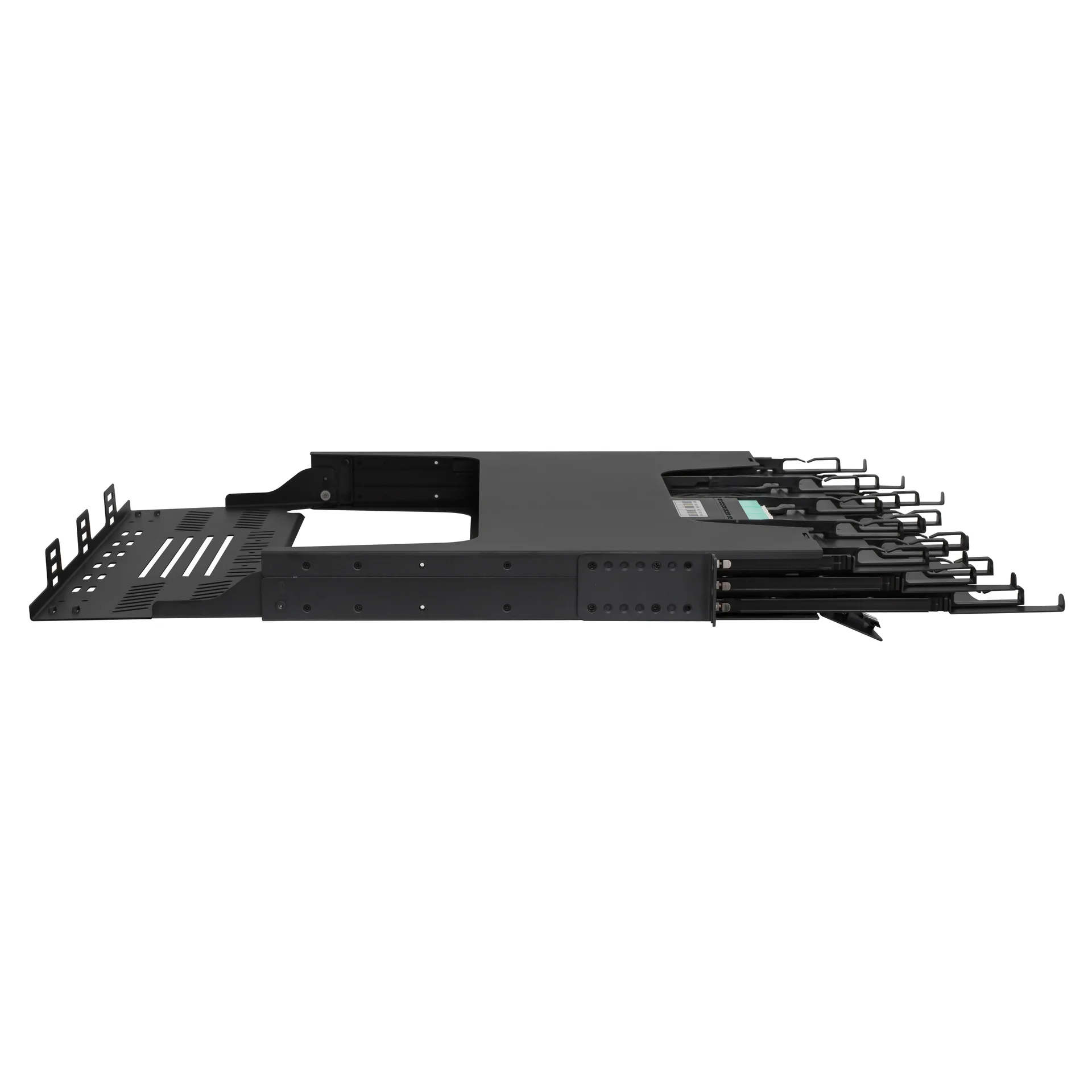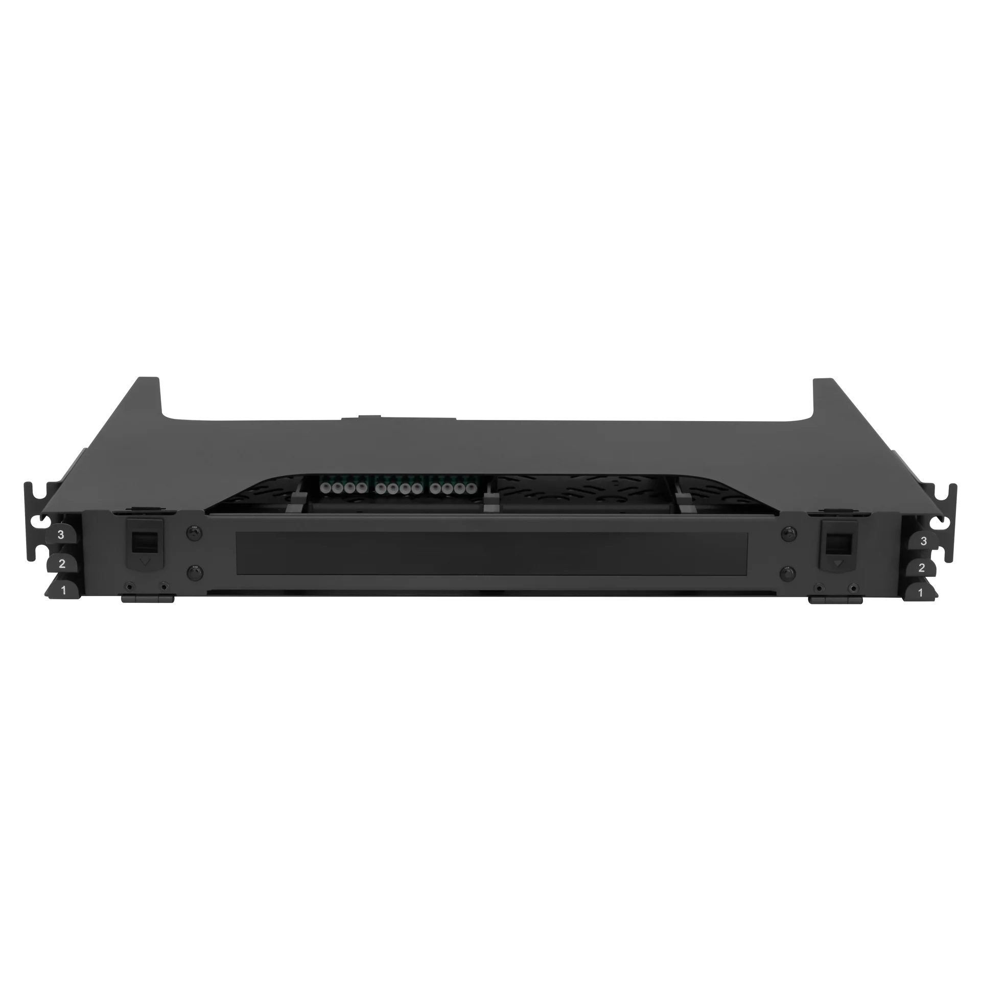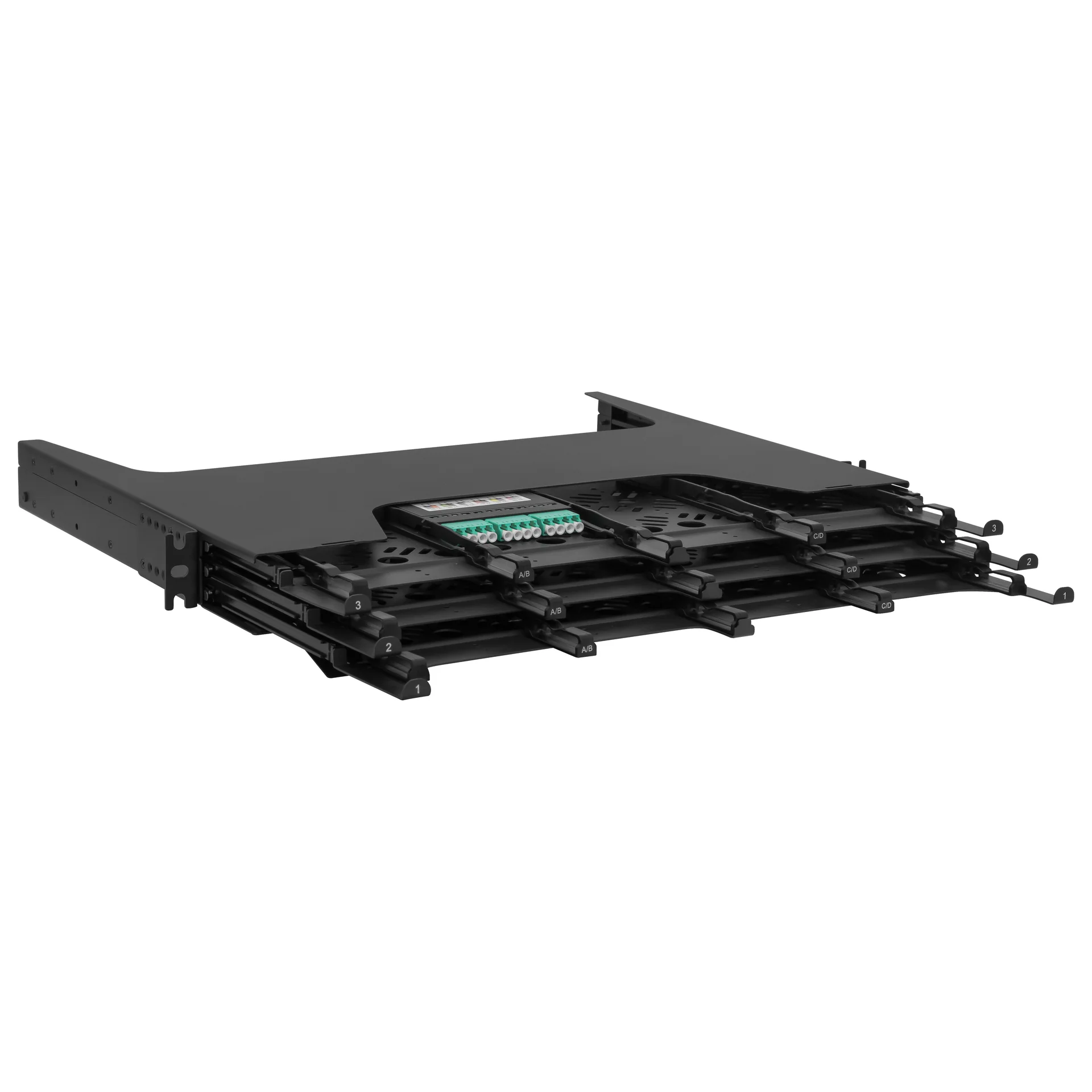 В эргономичном 1U корпусе размещены 3 выдвижных полки, в каждую из которых устанавливается до 4 распределительных кассет емкостью 12LC каждая или 6 распределительных кассет емкостью 8LC каждая . Выдвижной механизм существенно упрощает процесс монтажа и обслуживания.