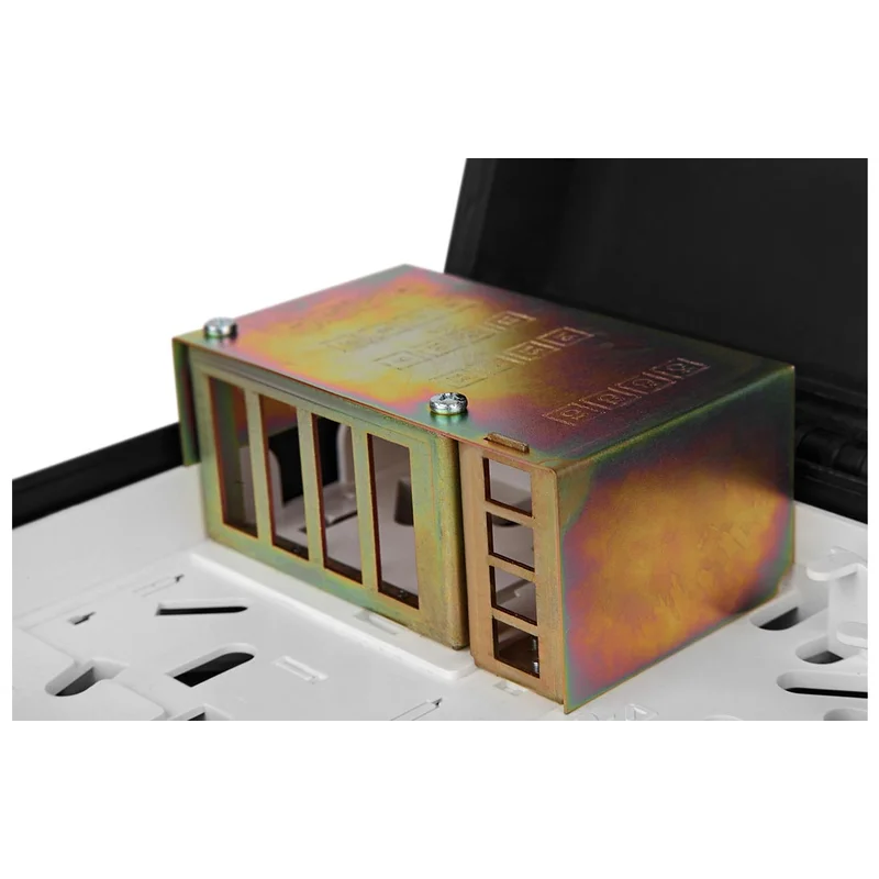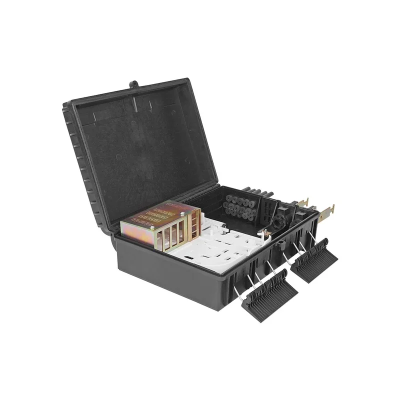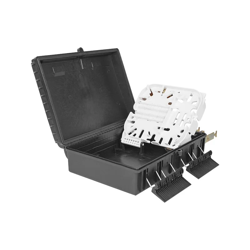 Выполнена из пластмассы и имеет пыле-брызгозащищенную тупиковую конструкцию (ввод ОК и вывод ШОС производится с одной стороны).