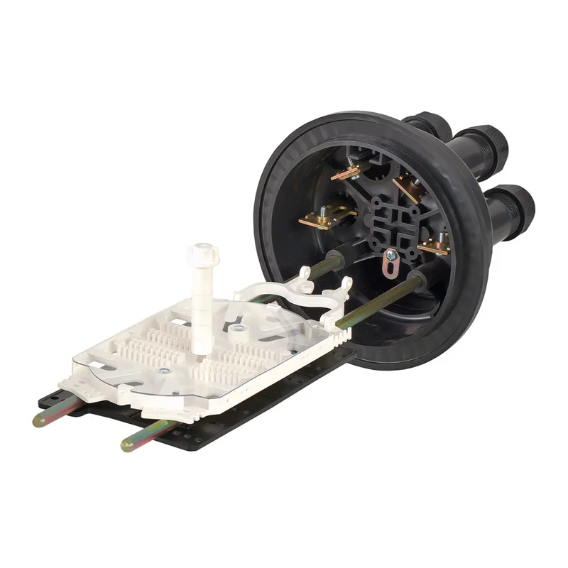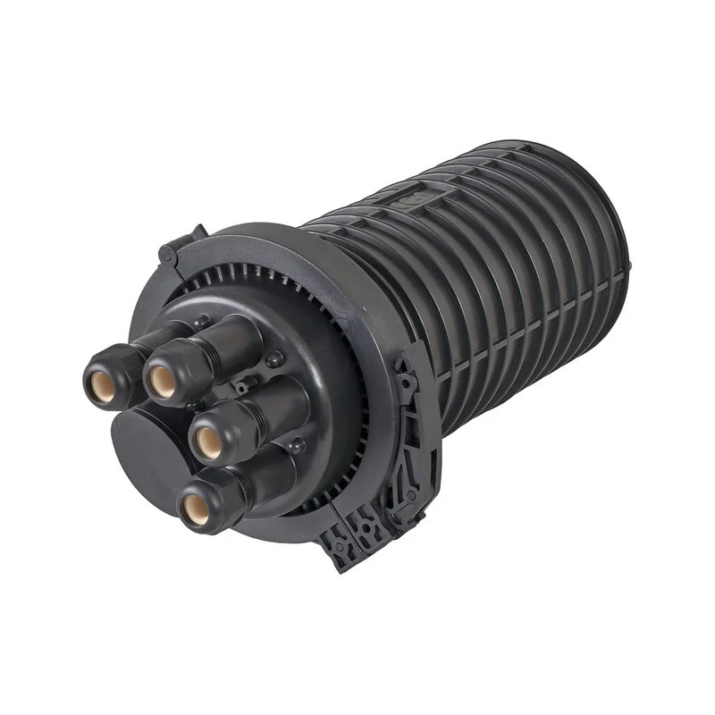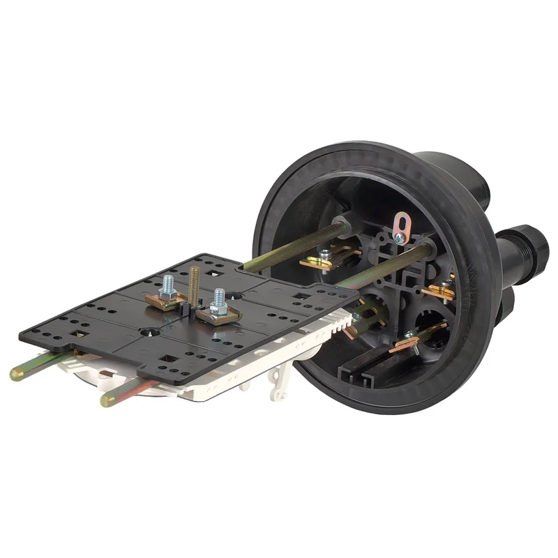 Ввод кабеля, крепление и герметизация осуществляется с помощью резьбовых фитингов, отлитых непосредственно на оголовнике муфты. Муфта имеет четыре круглых патрубка с фитингами и один овальный, герметизация вводимых в который кабелей осуществляется также механическим способом. Используя специальные комплекты для ввода в овальный патрубок можно ввести как два отдельных кабеля так и транзитный. Заглушка овального ввода выламывается при помощи молотка.
